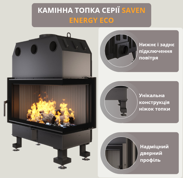 Топка SAVEN Energy 85х50х47L (17,0 kW) ECO швидко нагрівається і довго зберігає тепло в приміщенні, чим не тільки економить витрати на паливо, а й зберігає комфортну температуру і затишок в домі.