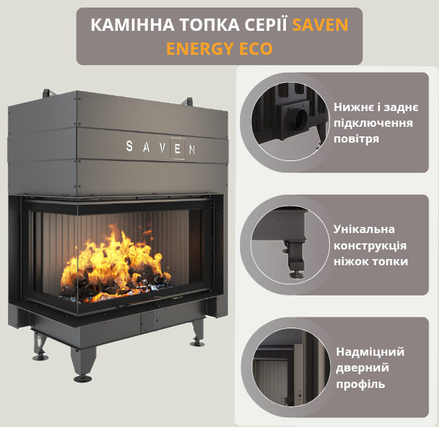 Металева закрита топка SAVEN Energy виготовлена з жаростійких матеріалів, здатних витримувати високі температури. Високий ККД камінної топки дозволяє ефективно використовувати дрова для опалення та зберігати тепло у приміщенні тривалий час. Це — не просто топка для каміна зі склом, а потужний і надійний елемент системи повітряного обігріву.